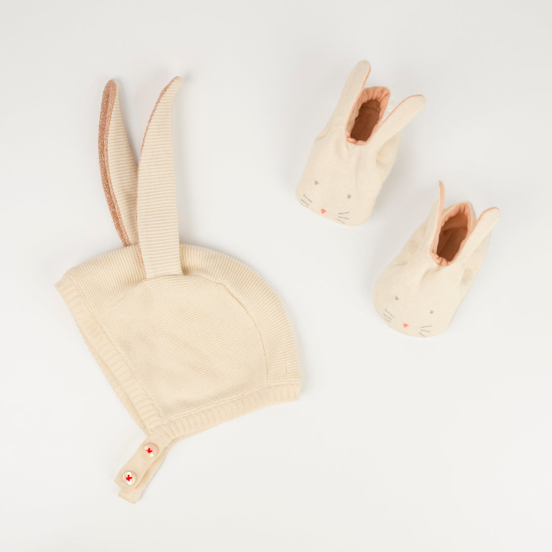 Babies will look adorable wearing our bunny baby bonnet and booties. They are beautifully crafted from soft knitted organic cotton, and make a great baby shower or newborn gift.