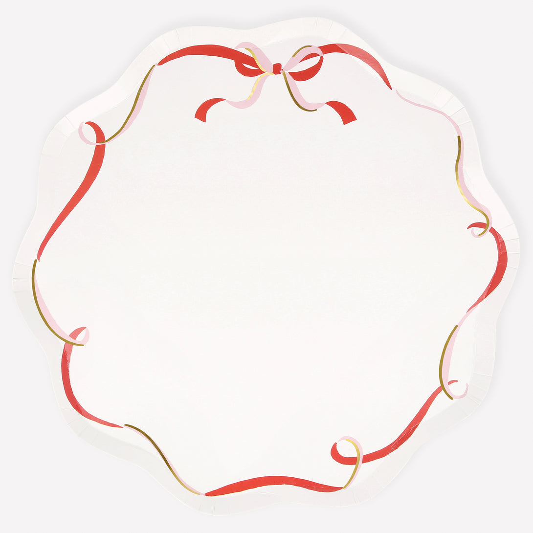 Pink and red ribbon bows are the perfect tableware design for an effortlessly chic Christmas table. The rich warm red brings classic festive charm, the soft pink and shiny gold foil accents give a contemporary twist, and the bow design adds fashionable flair. These paper Christmas dinner plates, with wonderful wavy edges, are guaranteed to make your table look vibrant and stylish.