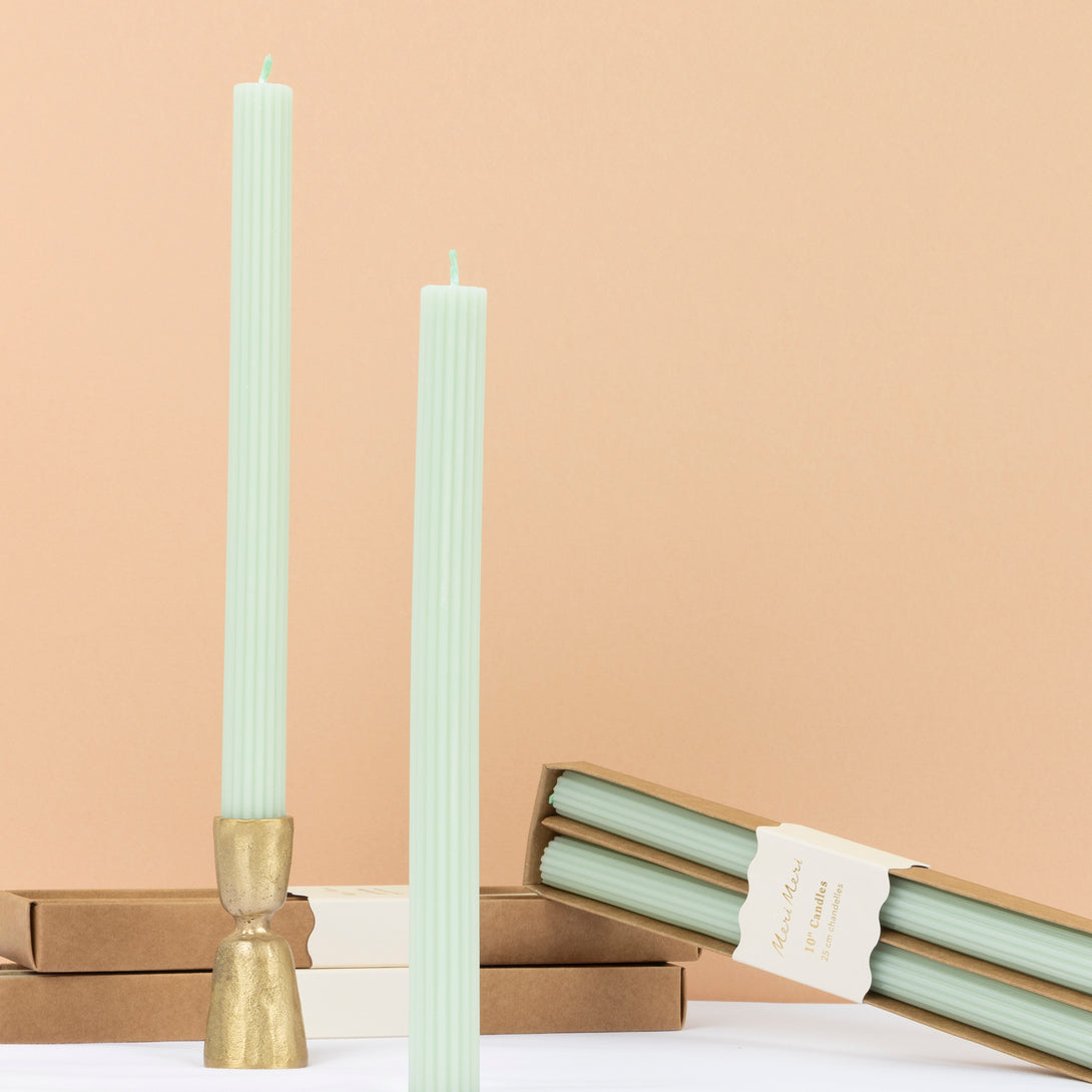 These striking mint-coloured candles have matching wicks with ridged details for an oh-so-stylish look. Use them to decorate your party table or mantel or give as a fabulous hostess gift.